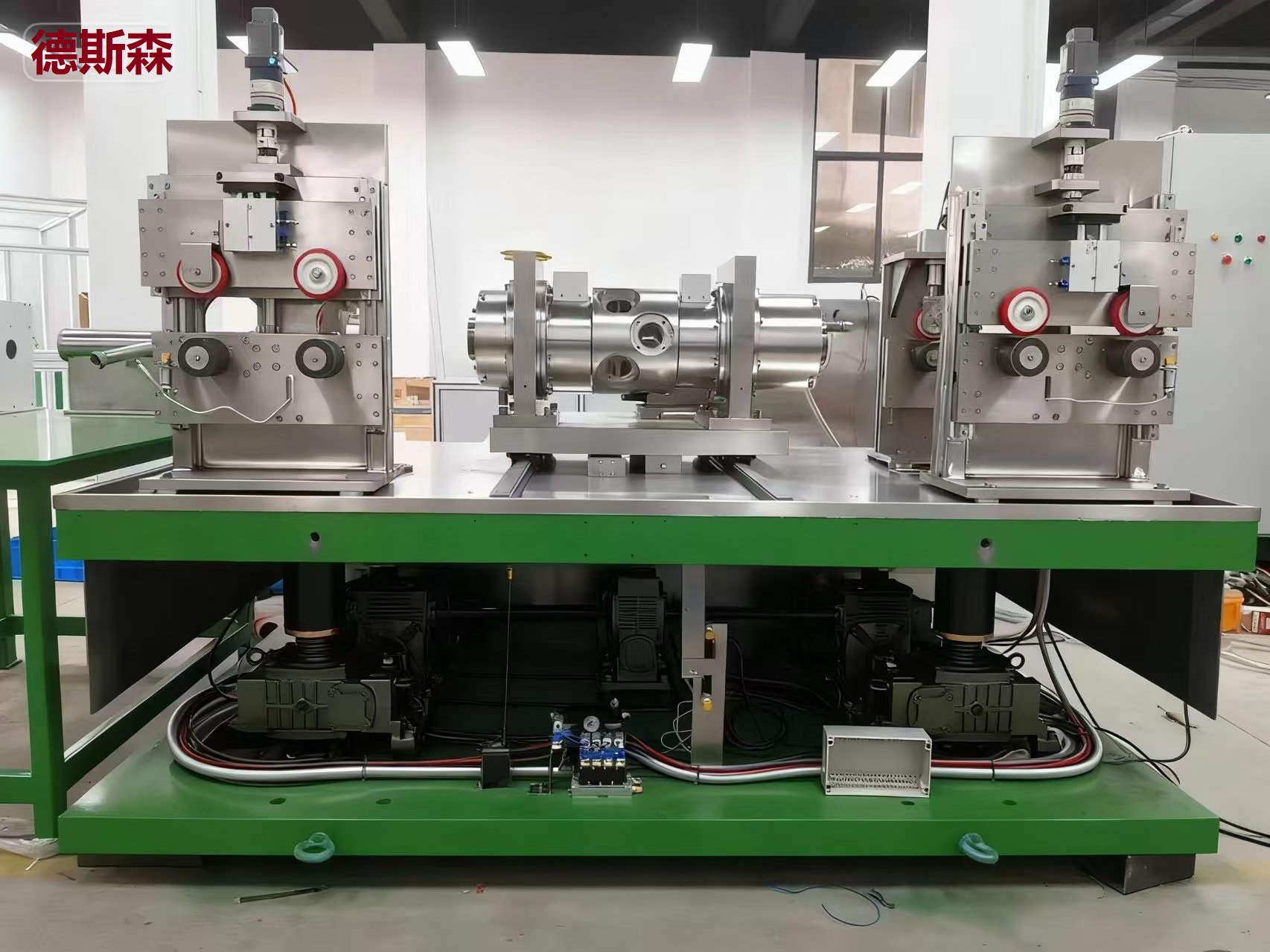 DSS-FUT31.59型基于德斯森无线传输的探头旋转式超声波探伤系统,这套系统主机带有自发电装置、无线发射和接收装置、探头三维调节装置、无橡胶圈的密封技术、精密电动升降装置采用4台独立的涡轮减速箱,大大提高了机头的稳定性。探头取得的缺陷信息经处理后的数据无线传输给全数字超声波探伤仪器,同样仪器将调节信号无线发射给旋转中的探头,不但大大提高了数据传输效率,同时也彻底排除了碳刷滑环的机械耦合或电容片的电耦合等容易受电噪声干扰的诟病。由于高速旋转的探头与静态的仪器是无线连接,无论有多少个通道,都能有效减少探伤信号的失真和衰减,从而大大提高探伤的信噪比,保证探伤的灵敏度和稳定性,防止误报或漏报,提高了各个通道的一致性和很高的探伤可靠性。现场实际测试中,在多台变频器、电焊机及上空行走的行车等密集开动的机、电、磁场的干扰环境下,德斯森无线传输探头旋转式超声波探伤主机即使在没有接地的情况下,也观察不到明显的干扰信号。